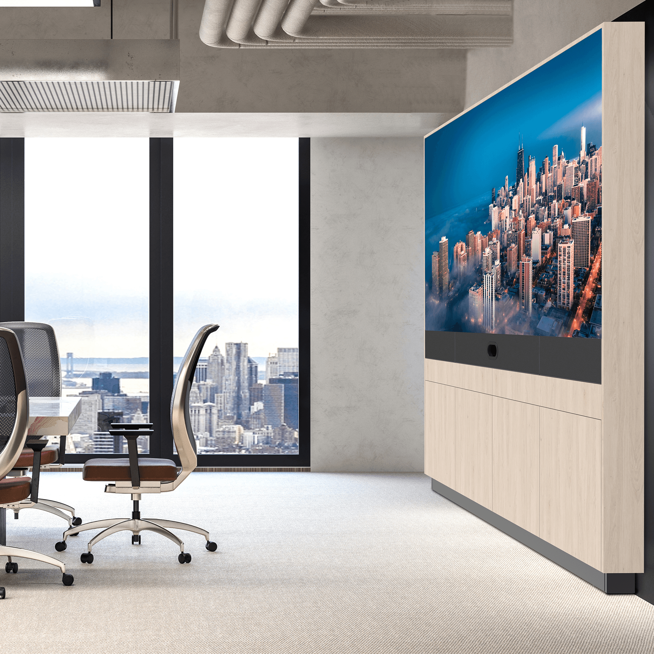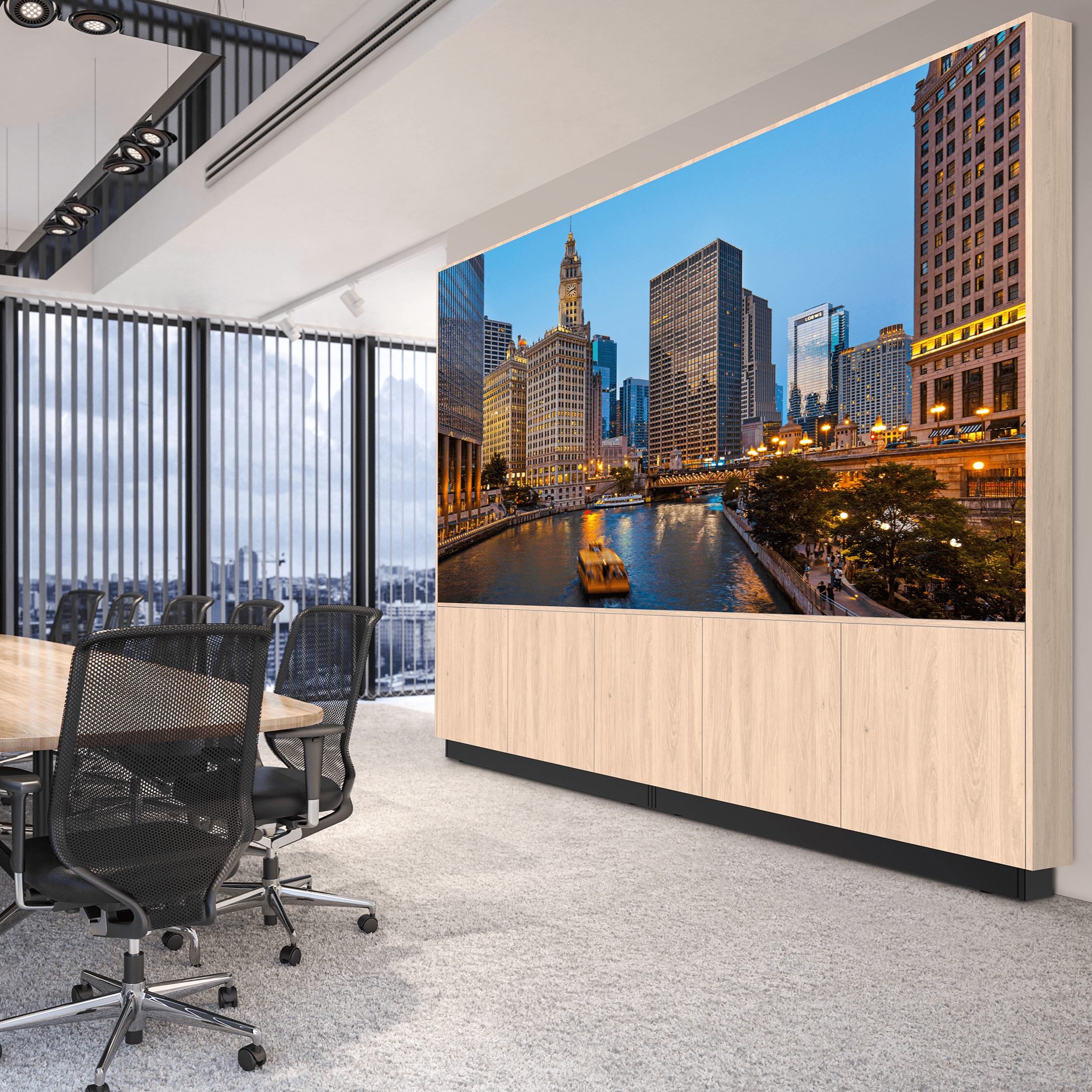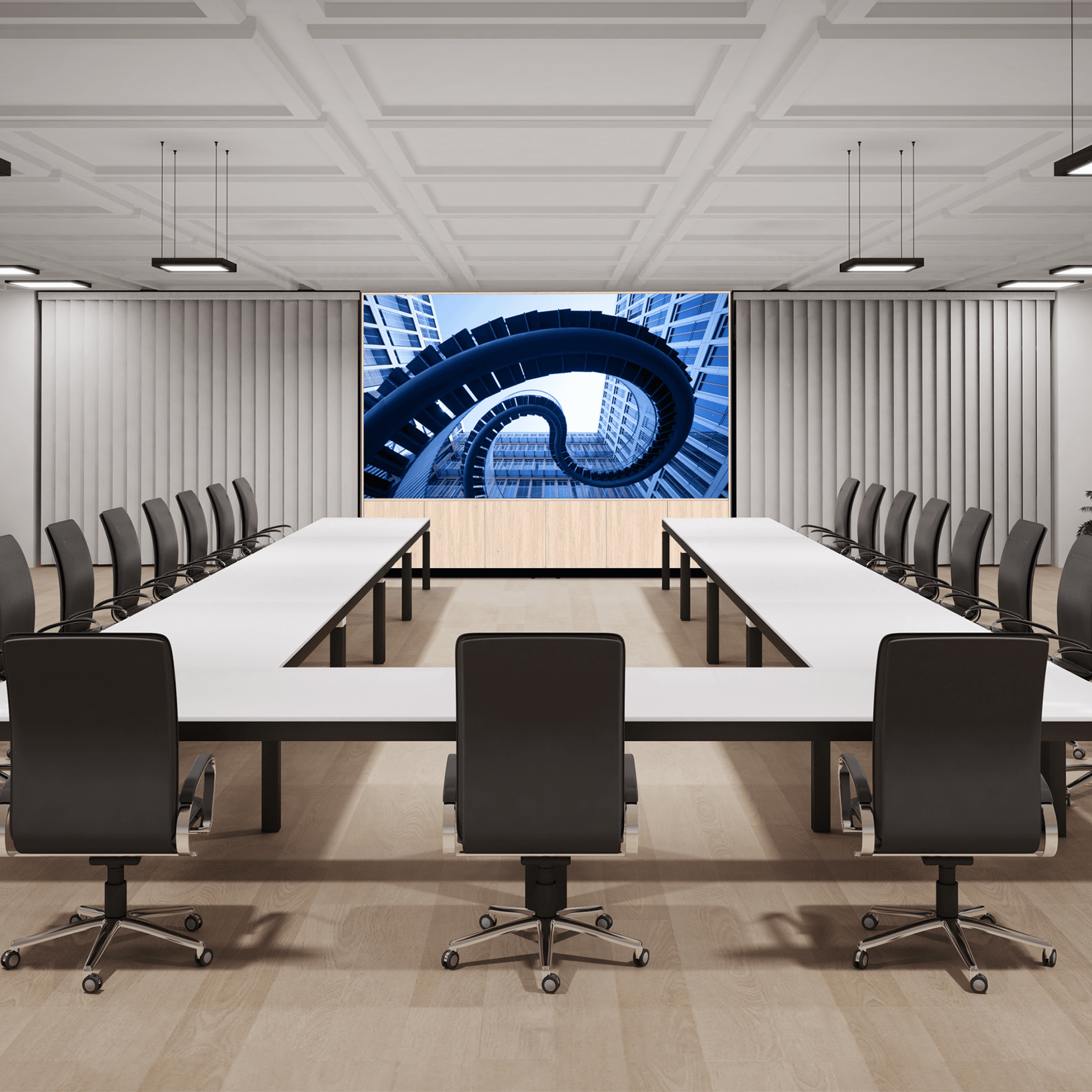 A refined, all-in-one dvLED media wall solution designed for high-end meeting environments.