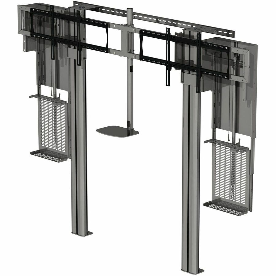 | Marketing Information | Thanks to technology advancements and the increased cost of travel, video conferencing is quickly becoming commonplace in business around the globe. Peerless-AV's floor to wall solution makes the implementation of video conferencing equipment that much easier. The mount's sleek design, compatible with any office decor, provides internal cable management and plenty of space for hardware storage. Two 2RU drop down racks, hidden behind the displays, are easily actuated and lowered below the display for easy service access. Displays in the 55" to 80" range can be set at the desired viewing angle with the camera shelf set accordingly. |